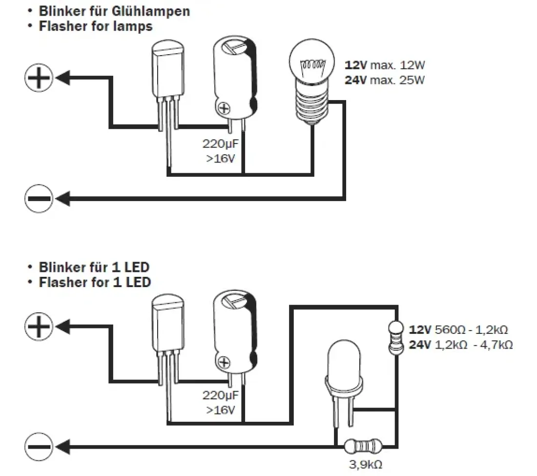 Sehr kleiner electronischer Blinkgeber, der beim Betrieb mit einer Glühlampe nur aus 2 kleinen elektrischen Bauteilen besteht. Schaltpläne für viele Variationen liegen bei. Es können auch LED`s angeschlossen werden, die dann aber mit zusätzlichen Vorwiderständen (liegen nicht bei) betrieben werden. Als Wechselblinker sind 3 zusätzliche Widerstände (liegen nicht bei) erforderlich, welche auf die jeweilige Konfiguration zugeschnitten sind. Die Bauteile müssen mit einem Lötkolben verbunden werden.
