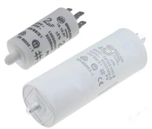 Kondensator zur Verwendung als: Motorkondensator, Betriebskondensator , Anlaufkondensator und Anlaßkondensator mit M8 Gewinde Befestigungsbolze und 6,3mm Flachstecker Anschlüsse. Gekapselt in Kunststoffbecher