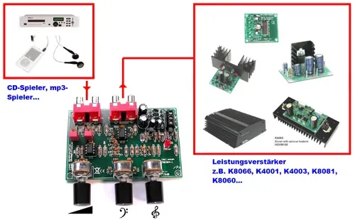 Wenn Sie einen unserer Verstärker (klein oder groß) verwenden, so brauchen Sie immer eine Lautstärke - und vorzugsweise auch eine Klangregelung. Dieser Satz wird mit allen Eingangs- und Ausgangsanschlüsse und Potentiometern geliefert. Außerdem können Sie auch das Eingangssignal verstärken oder dämpfen.